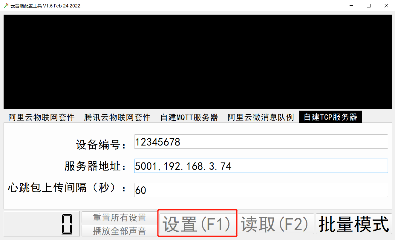 2. 打开“0.云音箱配置工具.exe”,将设备编号、心跳包上传间隔以及服务器地址设置到设备中,这里我们测试将设备连接到我们局域网的TCP服务器,IP地址为192.168.3.74,端口为5001,所以在设置中填写5001, 192.168.3.74。如下图所示: