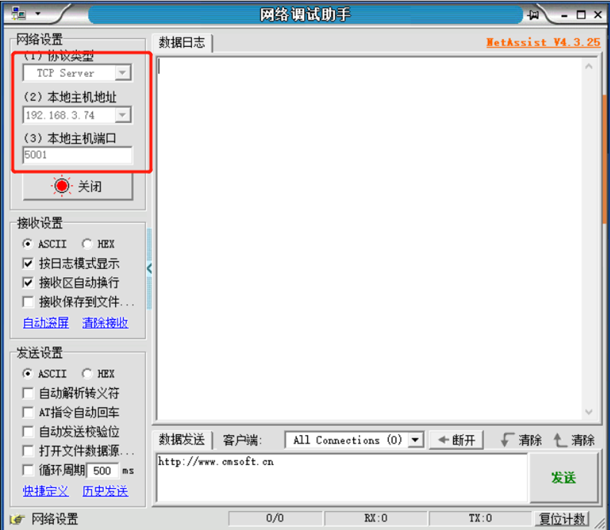 1. 测试设备功能,打开“网络调试助手”,按如下设置: