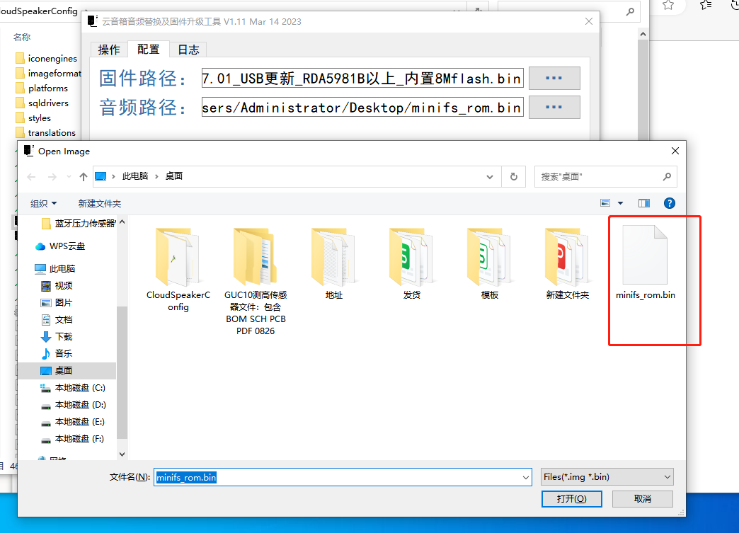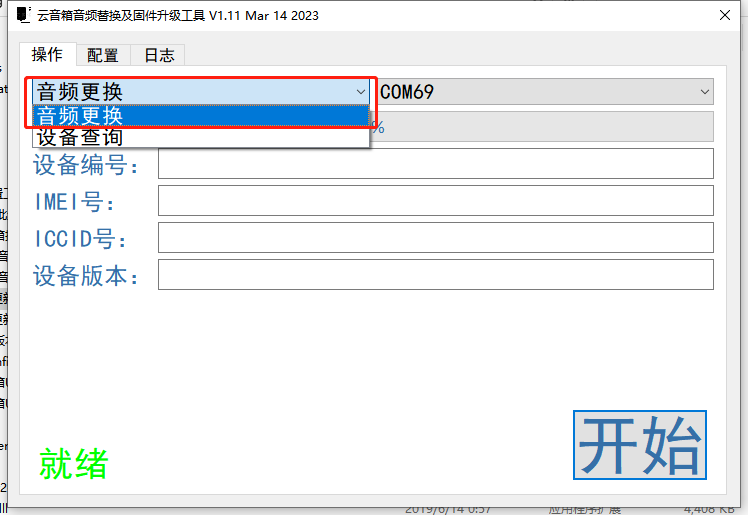 设备开机,使用数据线与电脑连接,此时软件界面,自动识别更新音频COM口,点击开始,等待音频更新完成。