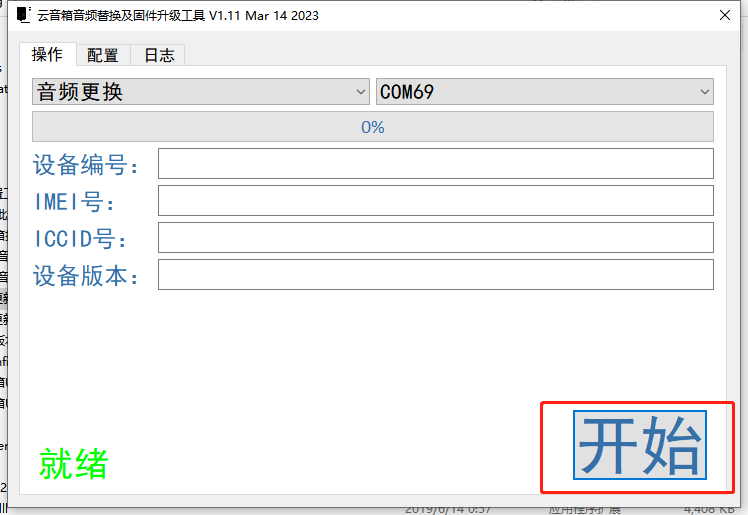 设备开机,使用数据线与电脑连接,此时软件界面,自动识别更新音频COM口,点击开始,等待音频更新完成。