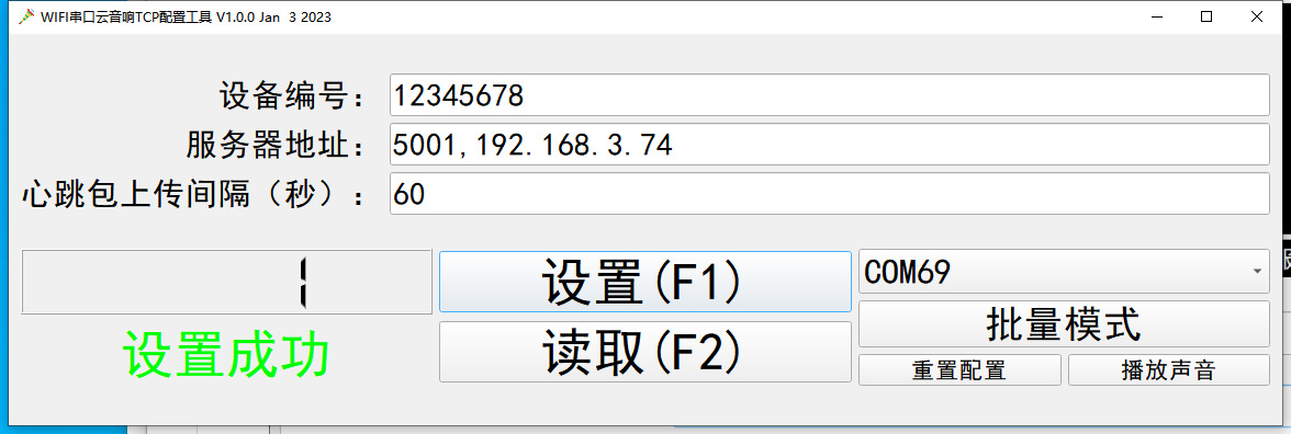 打开“9.WIFI云音箱USB串口TCP版本生产工具(新主板).exe”,将设备编号、心跳包上传间隔以及服务器地址设置到设备中,这里我们测试将设备连接到我们局域网的TCP服务器,IP地址为192.168.3.74,端口为5001,所以在设置中填写5001, 192.168.3.74。如下图所示: