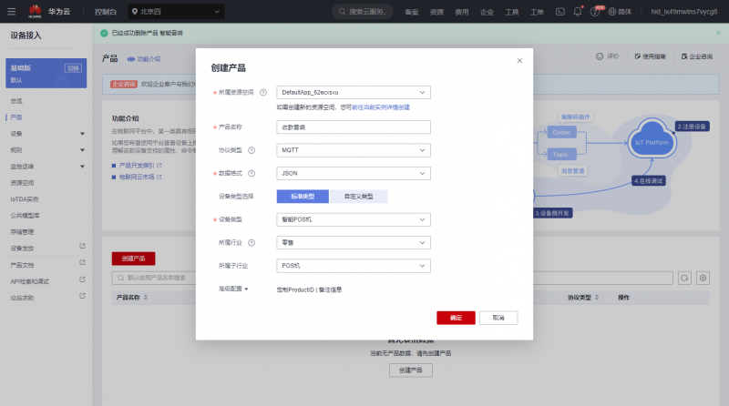 创建产品,协议类型与数据格式必须是MQTT和JOSN,如下图所示:
