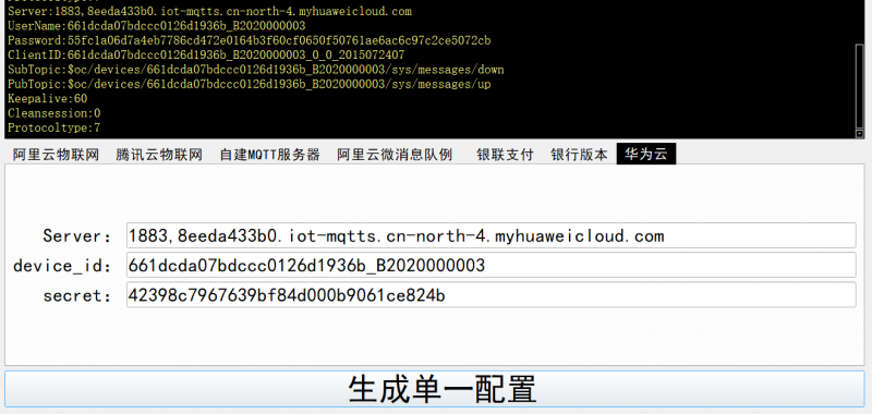 打开“MQTTConfigTools(WIFI客户版).exe”,将服务器参数、设备ID、设备密钥等参数填写进工具中,这里我们测试将设备连接到华为云服务器,如下图所示。