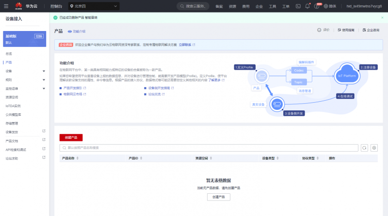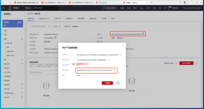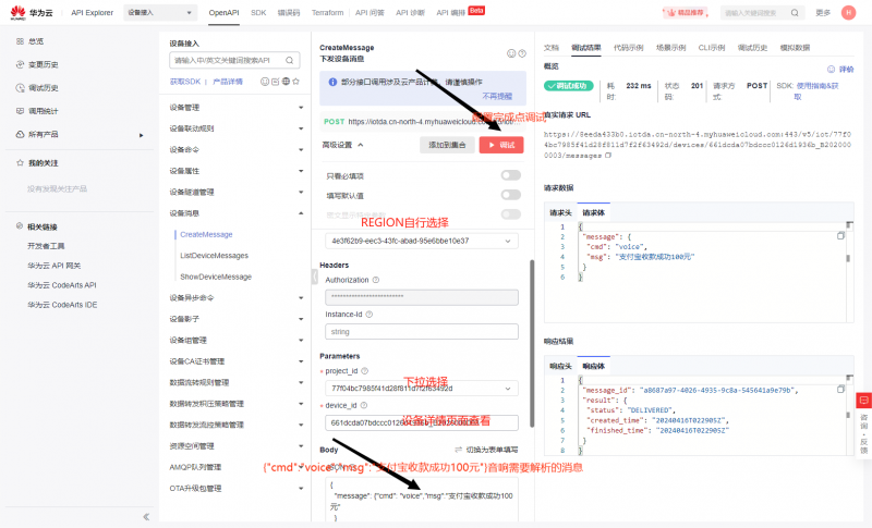 测试设备功能,打开华为云官网进入API在线调试,按如下设置:
