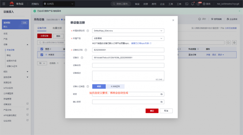 创建单个设备,(批量生成,请按照官网步骤就行操作,最后生成结果导出即可,以供工厂操作)。如下图所示: