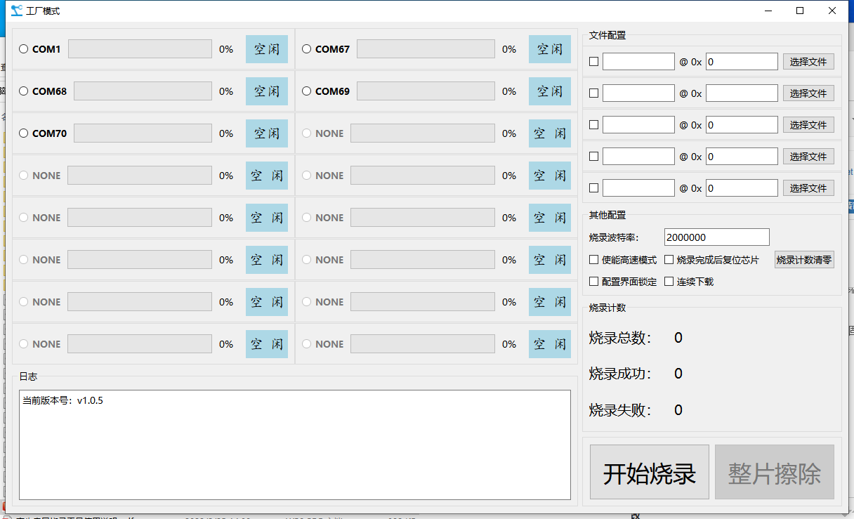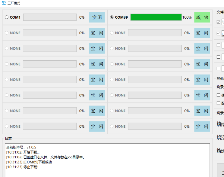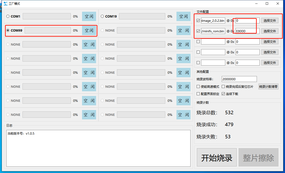 在工具界面,选择对应串口后,在右边文件配置区域,选中所需要升级的固件或内置网页。(