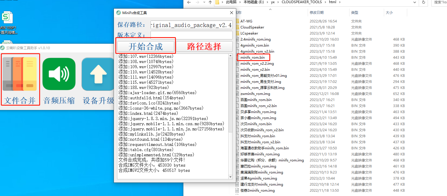 我们可以先删除原始音频包中不需要的音频文件。然后将8.3步骤中sound文件下压缩好的音频文件,全部拷贝到原始音频包同一目录下。打开“cloudspeaker_tools.exe ”,点击“合并文件”:
